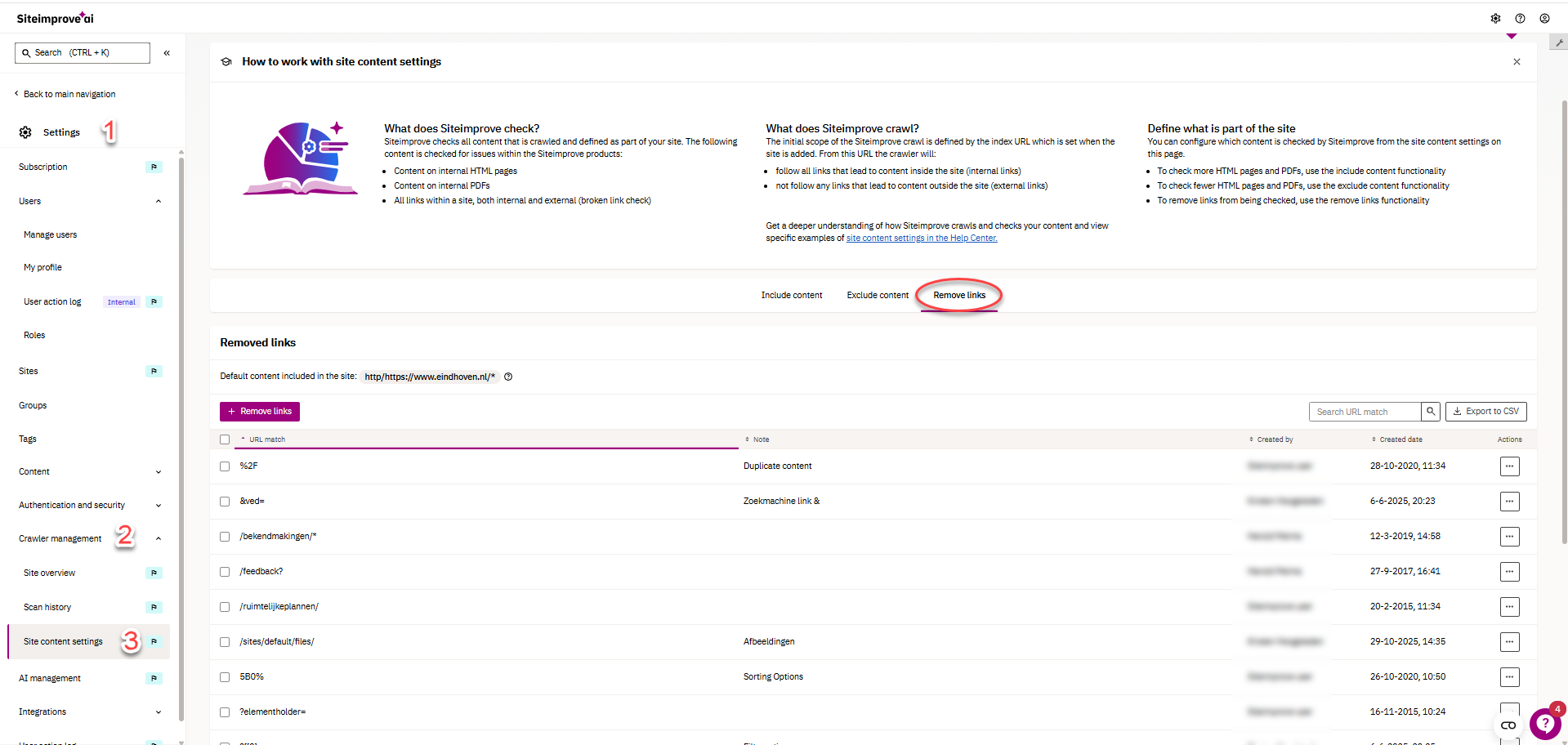 To see a list of the exclusion on your website go to Settings > Crawl management > Site content settings > go to applicable site > Remove links: